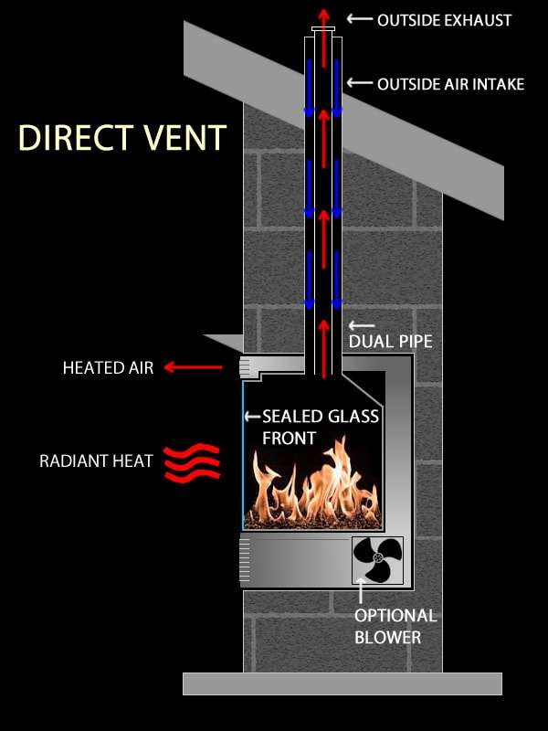 Rather than using oxygen from inside the home, direct vent fireplaces suck outside air through a pipe into the fireplace. A separate pipe exhausts the combustion gases outside. These vents can be two separate pipes or co-axial (a smaller pipe inside a larger pipe). One reason direct vent is the most popular fireplace vent type is they’re one of the safest of the bunch. Being a sealed system, virtually all combustion gases are expelled outdoors regardless of the homes air flow or room pressure changes.