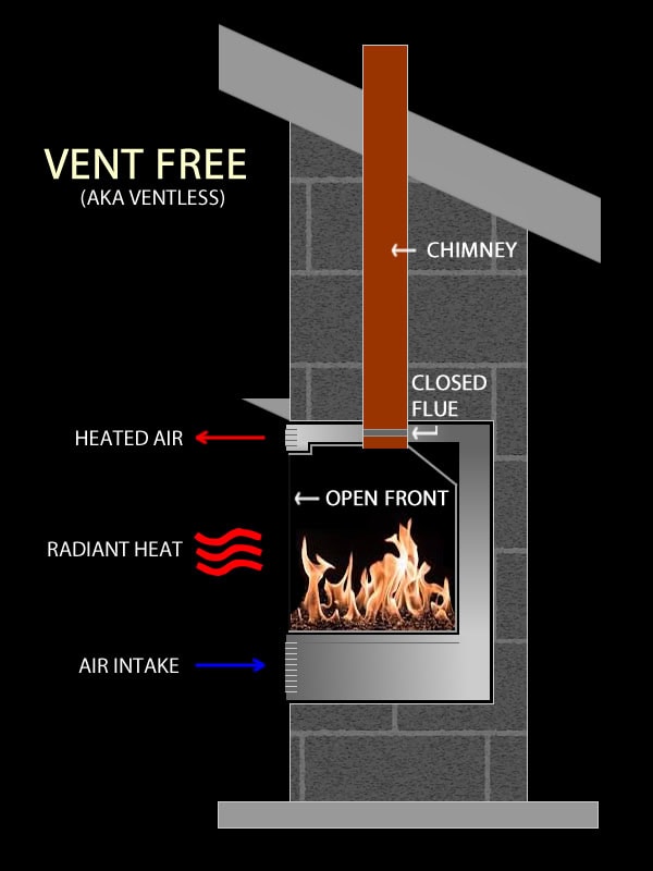 Like a natural vent (b vent) fireplace, vent free fireplaces take their oxygen from the homes inside air. Unlike a natural draft fireplace however, ventless fireplaces are extremely efficient. In fact, ventless fireplaces are the most efficient of the 4 fireplace vent types we’ve discussed in this article. It’s not unusual to see vent free fireplaces that are 99% efficient.