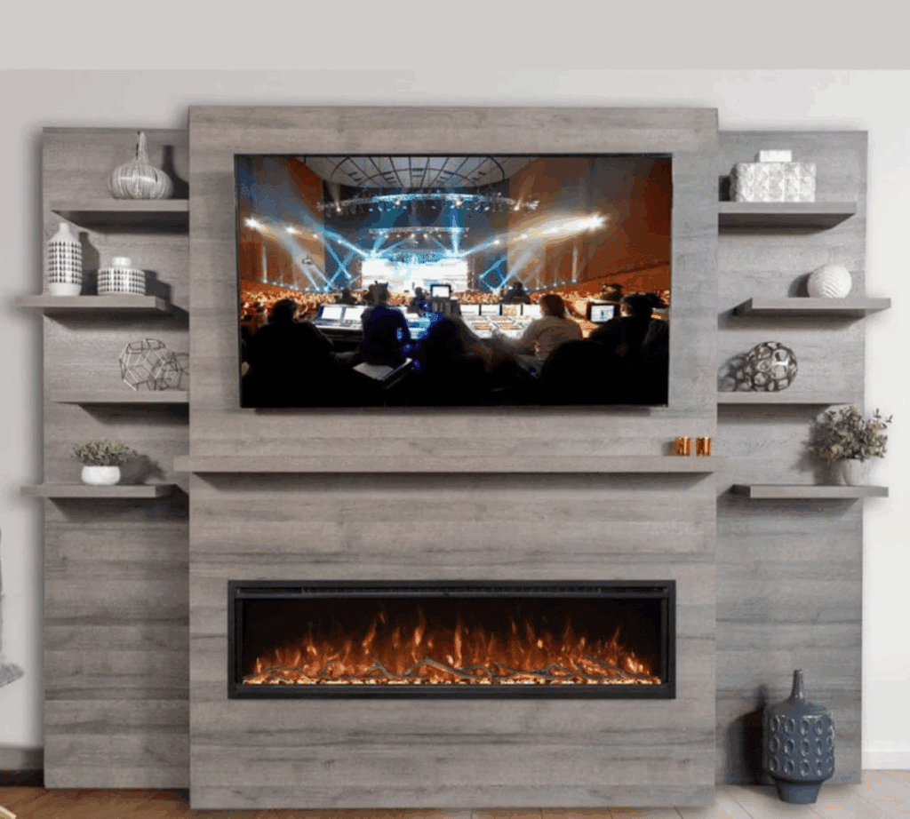 For a streamlined solution, consider the Modern Flames Allwood Media Wall System. Let us install it for you, or do-it-yourself and save! We’ll even deliver it to your home free with our, “we love locals” free local delivery option. Imagine having an entire new fireplace media wall complete with a 60″ linear fireplace, a built-in mantel, a place to hang your TV with no cords showing, 4 built-in electrical outlets and 4 USB charging ports, and adjustable floating shelves – all installed in 1-day! The Modern Flames Allwood Media Wall features: