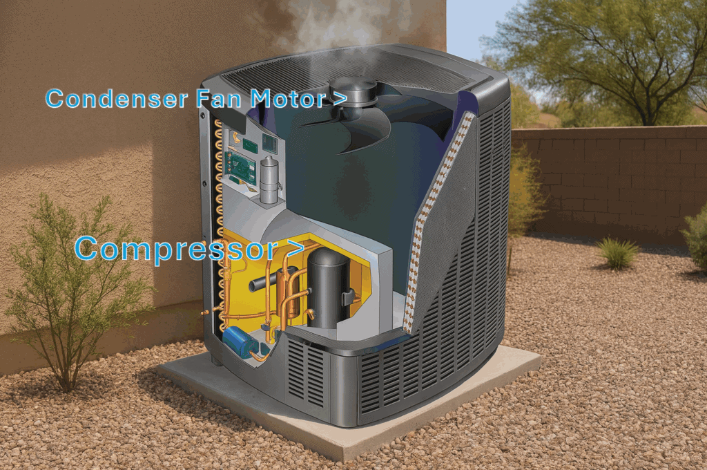 To understand the cause of the grinding, let’s go over which parts in your AC system move—because the noise is usually coming from a moving part.